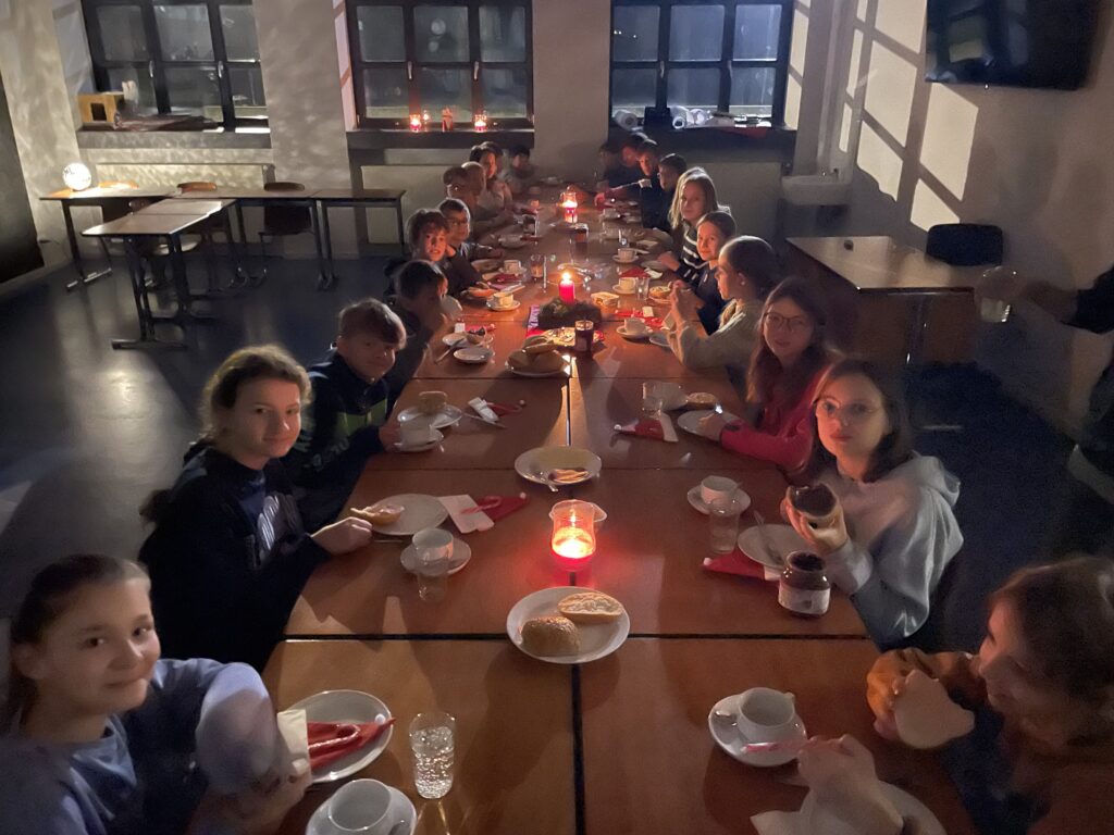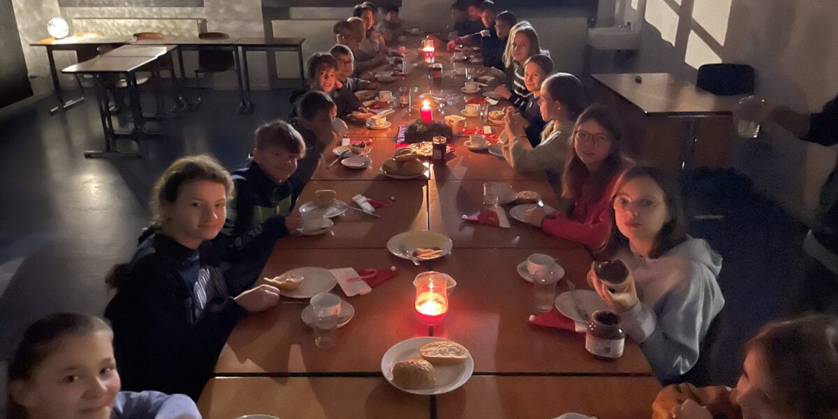 Einmal in die Schule kommen, wenn es noch stockdunkel ist und kaum ein anderer da ist – diese Erfahrung machen gerade jeden Freitagmorgen um 7:00 Uhr über 40 Schülerinnen und Schüler, die das Angebot der Fachschaft Religion wahrnehmen, sich an den vier Freitagen des Advent in einer mit Kerzen und Lichterketten gemütlich gestalteten Frühschicht mit gemeinsamem Singen und dem Hören von Geschichten auf Weihnachten einstimmen zu lassen. Besonders reizvoll ist für die Teilnehmenden sicher auch nach der Frühschicht das gemeinsame Frühstück bei Kerzenschein, welches die Leiterin unserer Mensa, Frau Welp-Schlautmann, mit engagierten Eltern mit viel Herz und Hand vorbereitet!